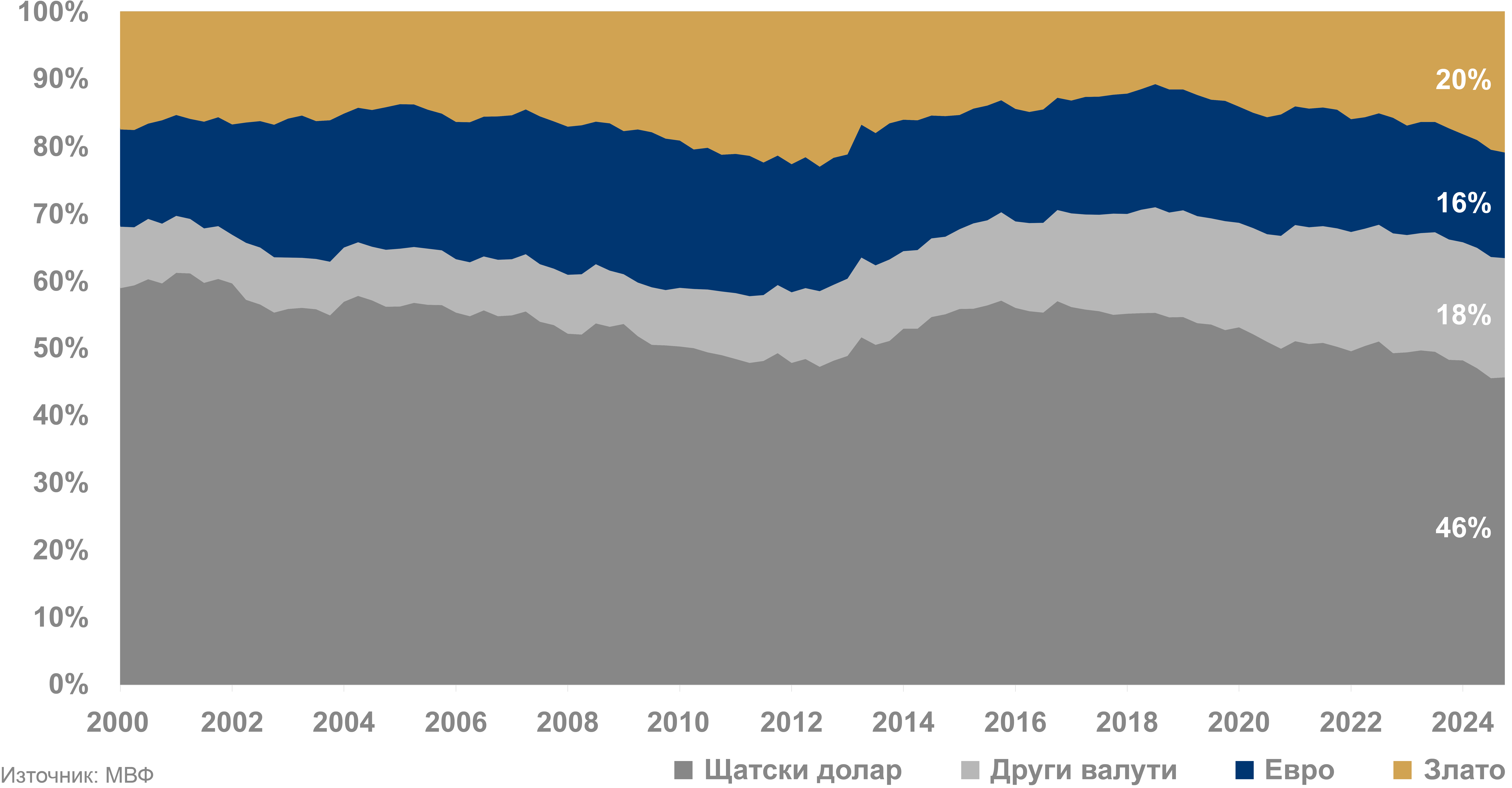 Делът на златото вече съставлява 20% от официалните валутни резерви на централните банки, докато този на еврото е спаднал до 16%. Американският долар остава на първо място с дял от приблизително 46%, но наблюдаваната промяна може да сигнализира дългосрочна трансформация в доверието към глобалните валути.