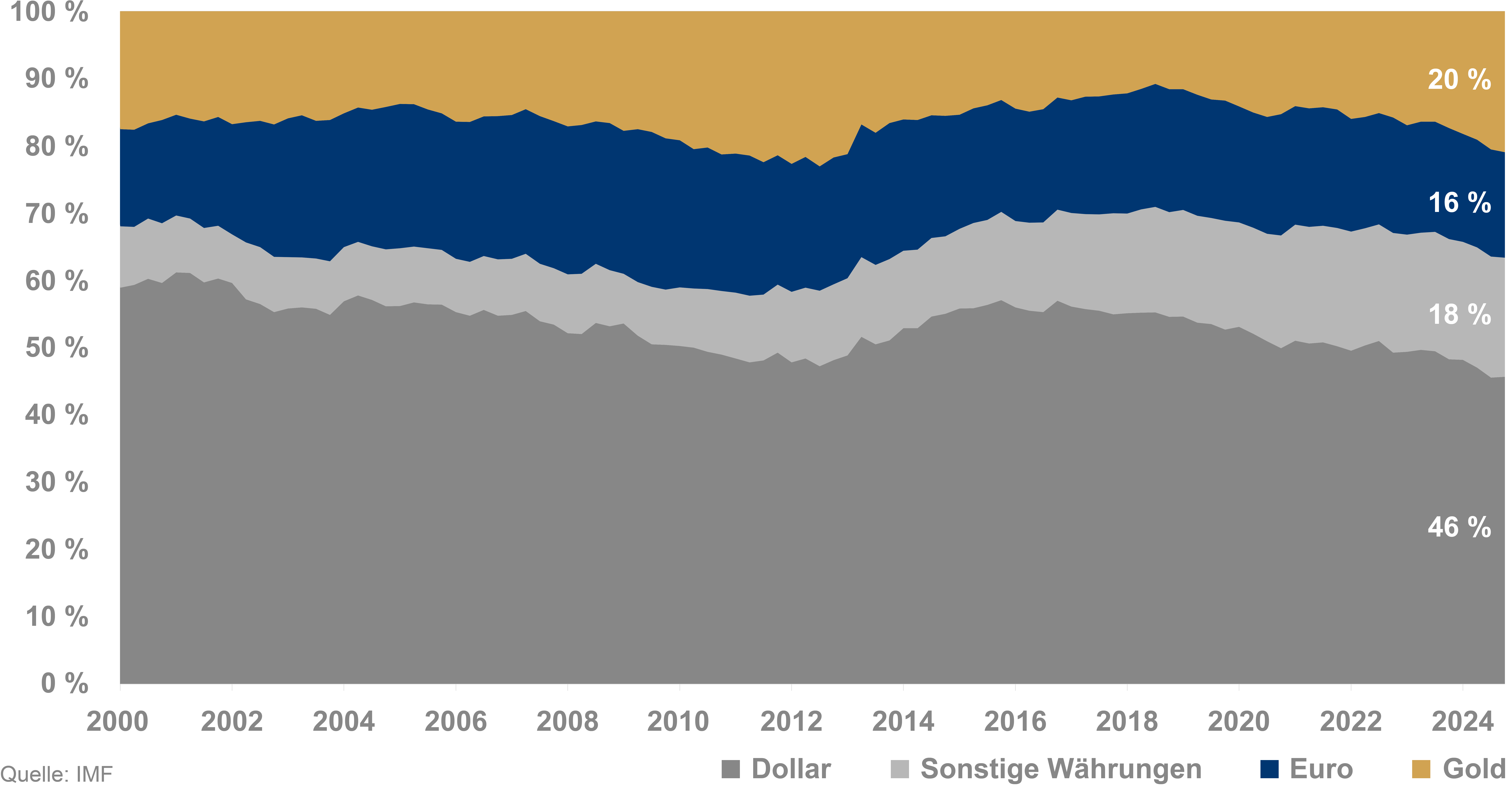 Gold macht inzwischen 20 % der offiziellen Devisenreserven der Zentralbanken aus, während der Anteil des Euro auf 16 % gesunken ist. An der Spitze steht nach wie vor der US-Dollar mit einem Anteil von rund 46 % – aber die Verschiebung, die wir jetzt erleben, könnte ein Zeichen für eine langfristige Veränderung des Vertrauens in Währungen sein.